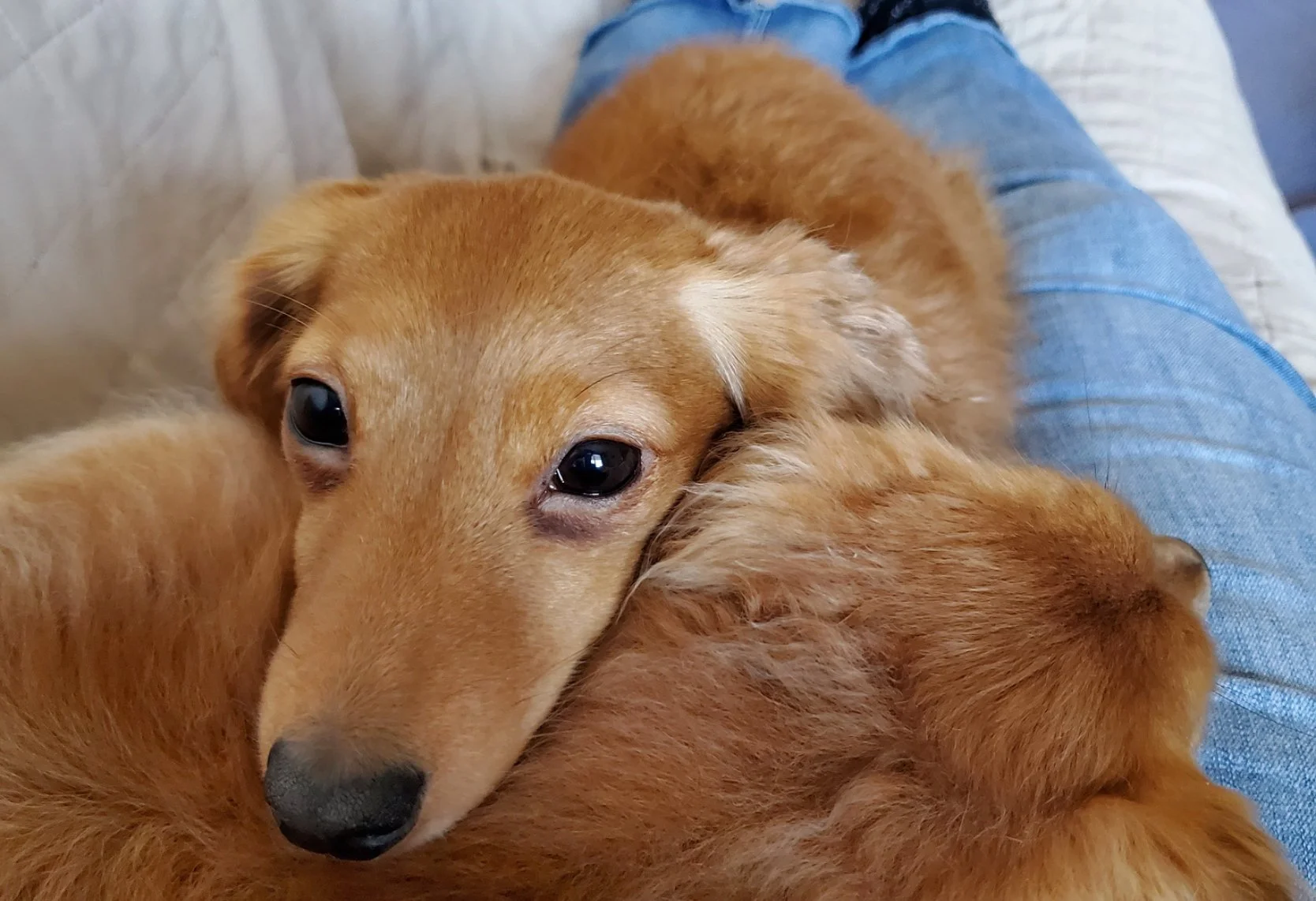 Buddy is a 7-year-old male tan miniature long-haired dachshund.