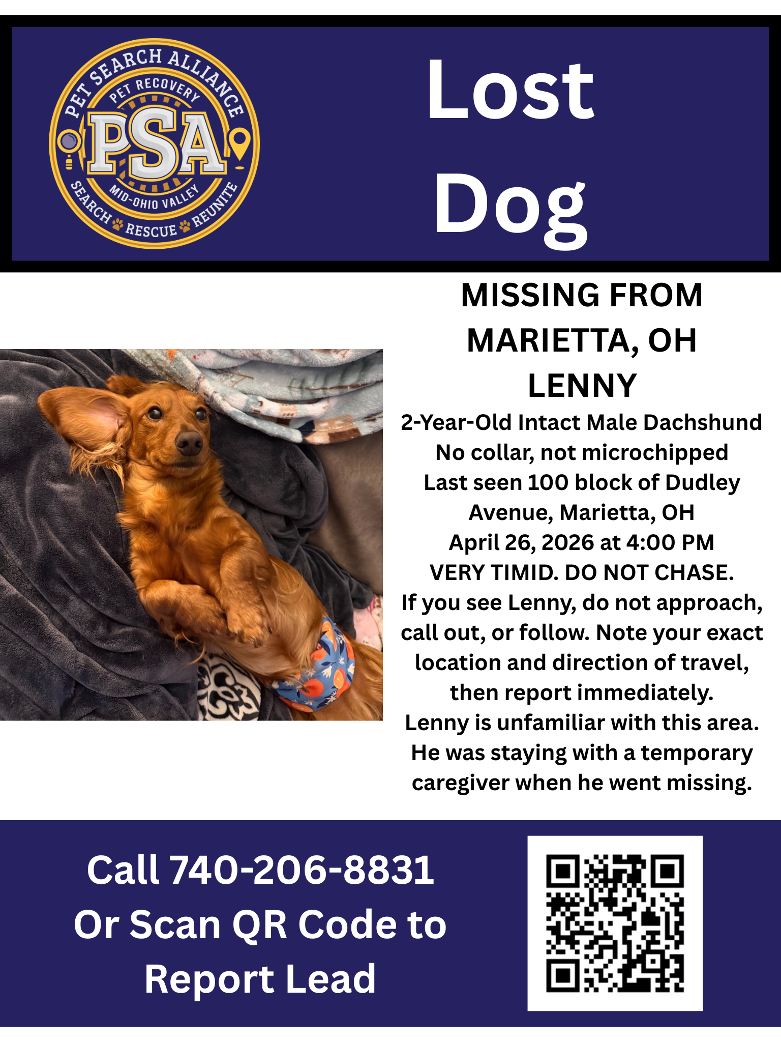 Lenny went missing on the afternoon of Sunday, April 26, 2026, after slipping away from a temporary caregiver near the 100 block of Dudley Avenue in Marietta, Ohio. He was not at his primary residence at the time. This is operationally significant. Lenny has no anchor point in the area and no familiar landmarks to draw him back home. Dogs in this situation tend to keep moving rather than circle back to a known location.